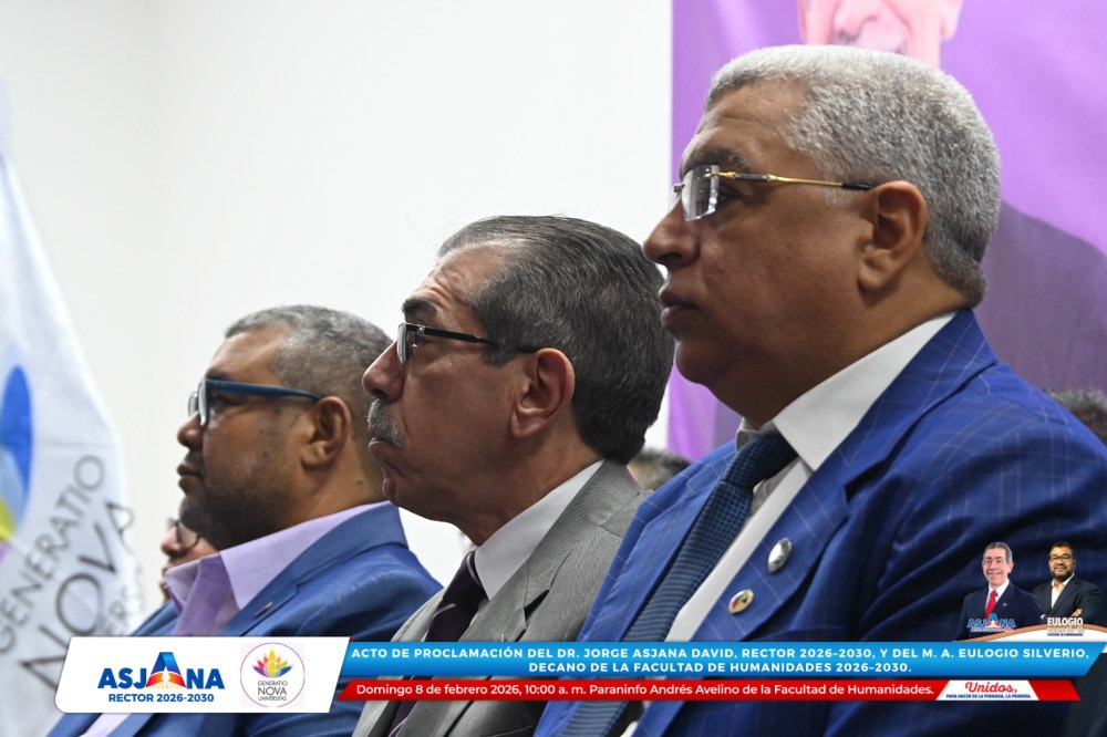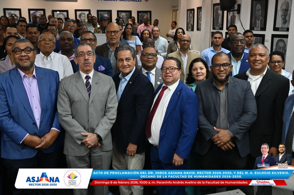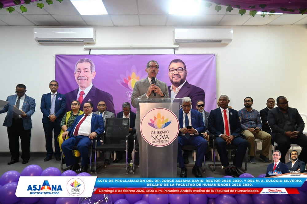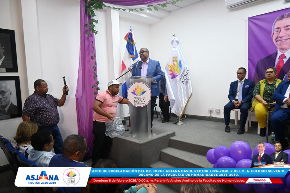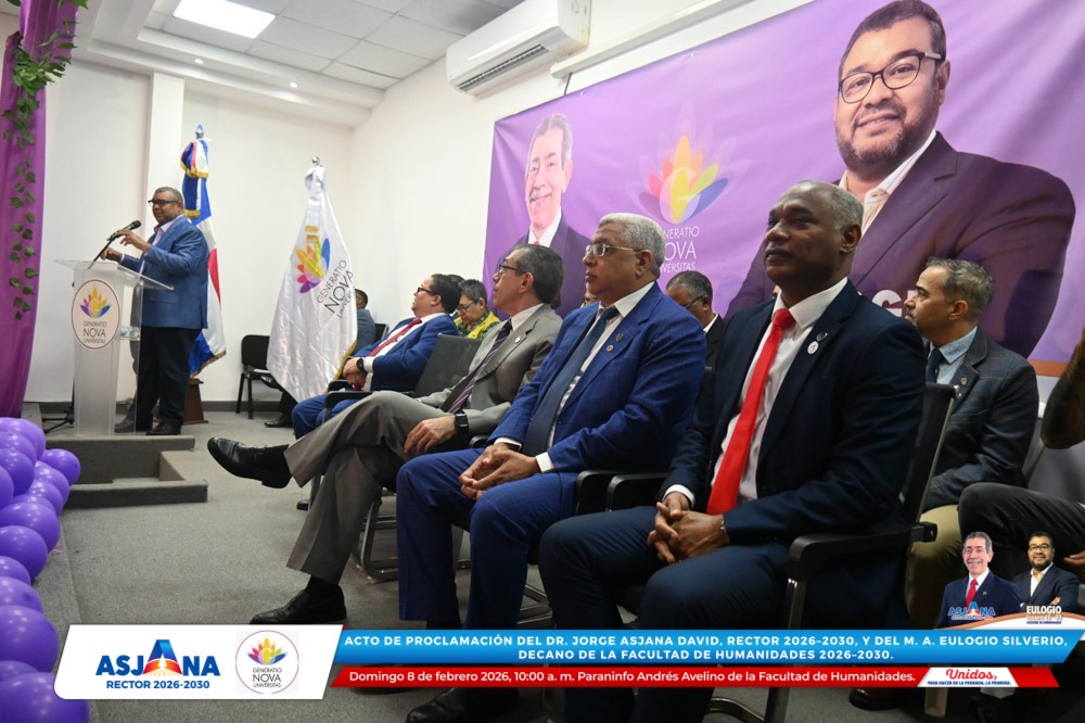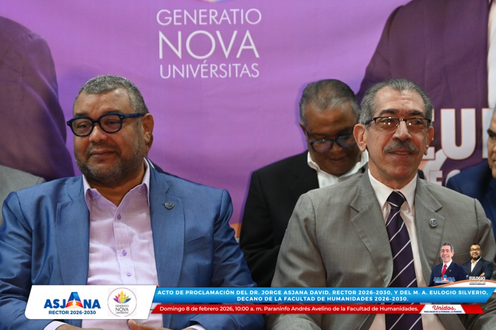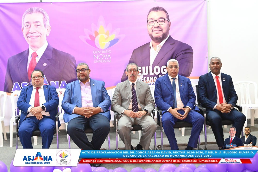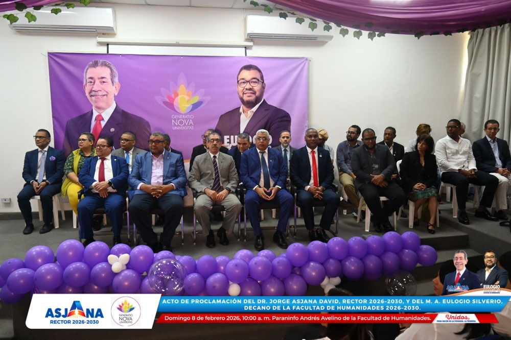 El movimiento académico Generatio Nova Univérsitas realizó el acto de proclamación del Dr. Jorge Asjana David como Rector de la Universidad Autónoma de Santo Domingo (UASD) para el período 2026–2030, así como del M. A. Eulogio Silverio como Decano de la Facultad de Humanidades para el mismo período.