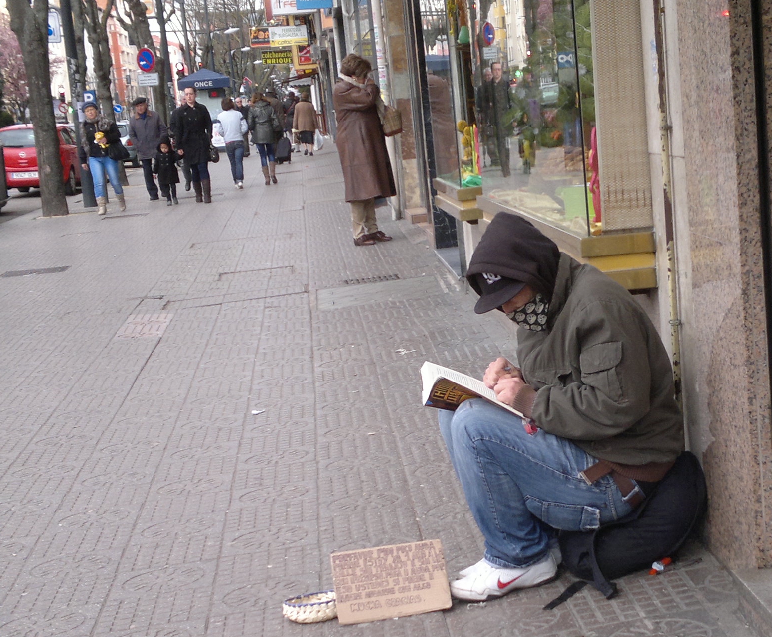 Pensando en todo esto me ha venido a la cabeza una imagen. Habrán pasado unos dos años (entonces creíamos que la crisis empezaría a remitir pronto y hasta veíamos espejismos de brotes verdes, ¿se acuerdan?), pero lo recuerdo. Resulta que apareció un mendigo nuevo en mi barrio. Bueno, estaba pidiendo, sí —-con un cartelito que rezaba algo así como “Sin trabajo, sin recursos”, y una cajita de cartón con monedas—, pero se notaba a la legua que no era un mendigo profesional. El hombre, en la cincuentena, con una pinta limpia, recia, de trabajador de nivel medio, estaba sentado en un bordillo y —algo inaudito en un mendigo— se entretenía leyendo una novela de misterio. El bordillo en cuestión era bastante alto, el entrante de un comercio. Como si al colocarse a media altura quisiera conservar cierto grado de dignidad. Los mendigos profesionales siempre se sientan en el suelo o en un bordillo prácticamente a ras de suelo. Puede haber cerca un banco público disponible, pero jamás pedirán sentados ahí, según una ley no escrita que todos conocen bien: con su actitud corporal, con su recogimiento y su incomodidad deben expresar humildad, clemencia, compasión.